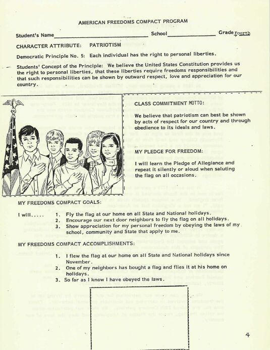 .jpg PAGE 1] AMERICAN FREEDOMS COMPACT PROGRAM Student's Name________________________________ School________________________ Grade _Fourth CHARACTER ATTRIBUTE: PATRIOTISM Democratic Principle No. 5: Each person has the right to personal liberties. Students' Concept of the Principle: We believe the United States Constitution provides us the right to personal liberties, that these liberties require freedoms responsibilities and that such responsibilities can be shown by outward respect, love and appreciation for our country.