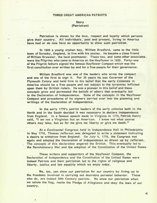 (Patriotism) Patriotism is shown by the love, respect and loyalty which persons give their country. All individuals, past and present, living in America have had or do now have the opportunity to show patriotism. In 1605 a young orphan boy, William Bradford, came to the little town of Scrooby, England, to live with his uncles. He became a close friend of William Brewster, the local postmaster. These two, and some other associates were the Pilgrims who came to American on the Mayflower in 1620. Forty-one of the Pilgrim fathers signed the famous Mayflower Compact which was the first constitution ever written by and for a free people for their governance. William Bradford was one of the leaders who wrote the compact and one of the first to sign it. For 30 years he was Governor of the Plymouth Colony and held firm in his belief that the early Colonists in America should be a free people and not subject to the tyrannies inflicted upon them by British rulers. He was a pioneer in this belief and these concepts grew and permeated the beliefs of others that eventually led to the Declaration of Independence. Some of the concepts in the Mayflower Compact and procedures of its signers carried over into the planning and writings of the Declaration of Independence. In the early 1770's patriot leaders of the early colonies both in the North and in the South decided it was necessary to declare independence from England. In a famous speech made in Virginia in 1775, Patrick Henry said, "I am not a Virginian but an American. I know not what course others may take; but as for me give me liberty or give me death." At a Continental Congress held in Independence Hall in Philadelphia in May 1776, Thomas Jefferson was delegated to write a statement indicating a desire to withdraw from England. On July 4, 1776, the Congress met again and adopted the Declaration of Independence as drawn up by Jefferson. The concepts of this declaration angered the British. This eventually led to the Revolutionary War and the adoption of the Constitution of the United States. These writers and supporters of the Mayflower Compact, the Declaration of Independence and the Constitution of the United States were indeed Patriots and their patriotism led to the rights of religion and liberty, justice and law equality which we enjoy today. We, too, can show our patriotism for our country by living up to the freedoms involved in carrying out desirable personal behavior. Those who do, are indeed 20th Century patriots. We show our patriotism when we salute the flag, recite the Pledge of Allegiance and obey the laws of our country.